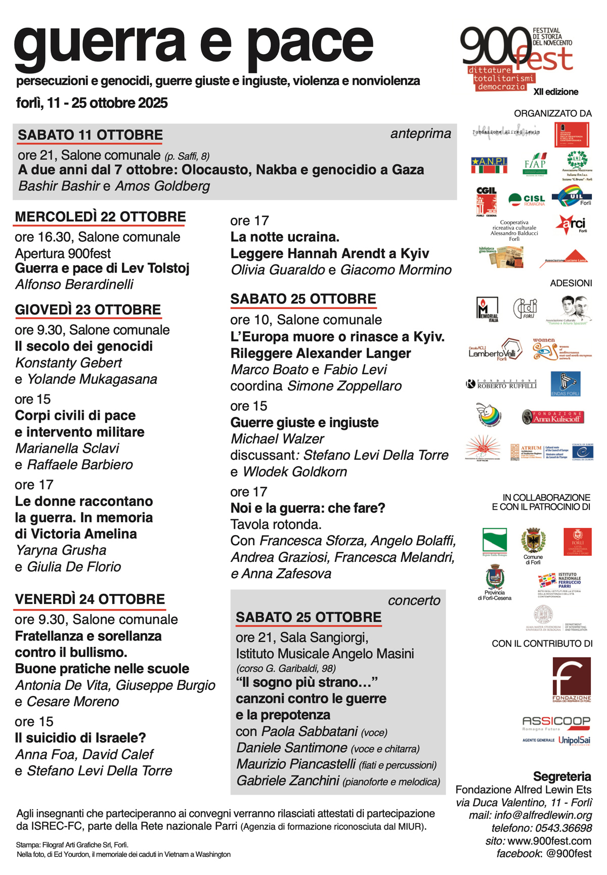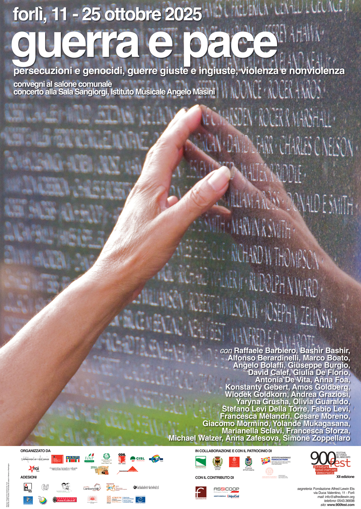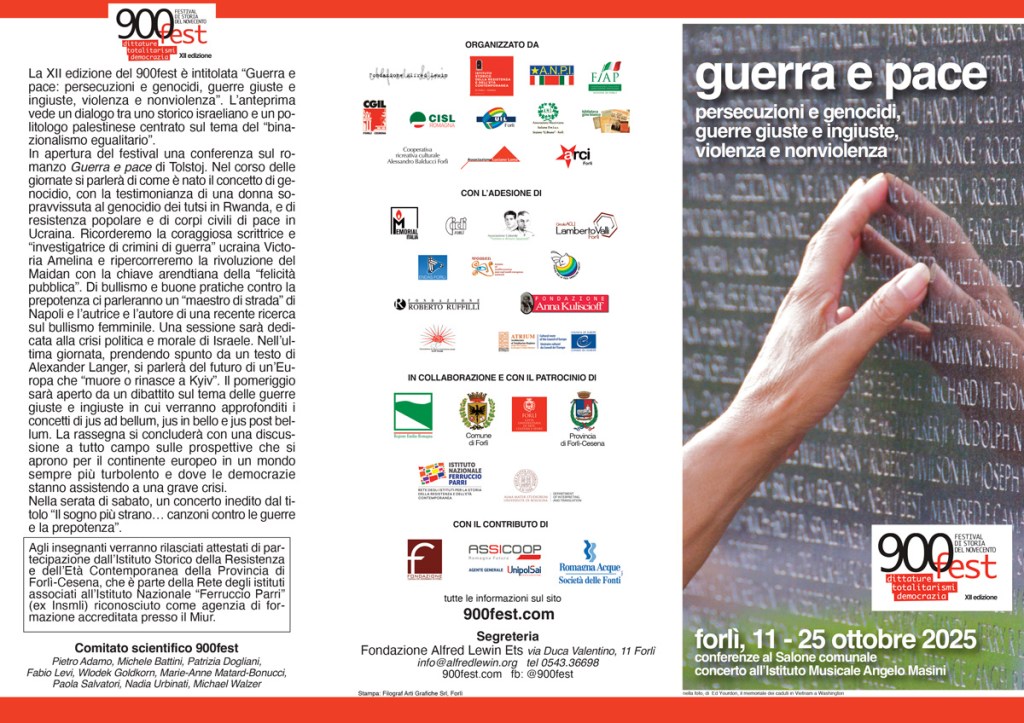 900fest è promosso da: Fondazione Alfred Lewin Collaborano: Istituto per la Storia della Resistenza e della Società Contemporanea, Anpi, Fiap Forlì, Ass. Mazziniana Italiana Forlì, Cgil, Cisl, Uil, Cooperativa Ricreativa Culturale Alessandro Balducci, Arci, Biblioteca Gino Bianco, Associazione Lama. Adesioni: Memorial Italia, Cidi Forlì, Ass Tonino e Arturo Spazzoli, Circolo Acli Lamberto Valli, Ass. Women, Fondazione Roberto Ruffilli, Endas Forlì, Centro Pace Forlì, Fondazione Anna Kuliscioff, Ass. di cultura e promozione sociale Olof Palme, Atrium. Collaborazione e patrocinio: Comune di Forlì, Regione Emilia Romagna, Provincia di Forlì-Cesena, Istituto Parri, Dipartimento di Interpretazione e Traduzione Forlì. Con il contributo di: Fondazione Cassa dei Risparmi Forlì, Assicoop/UnipolSai