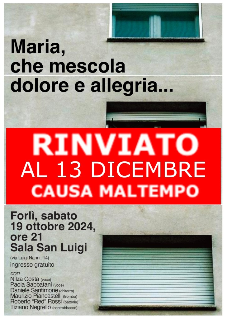 Si comincia sabato 19 ottobre presso la Sala San Luigi alle 21 con un’anteprima: il concerto gratuito “Maria, che mescola dolore e allegria” con Nilza Costa, Paola Sabbatani, Daniele Santimone, Maurizio Piancastelli, Roberto “Red” Rossi e Tiziano Negrello.